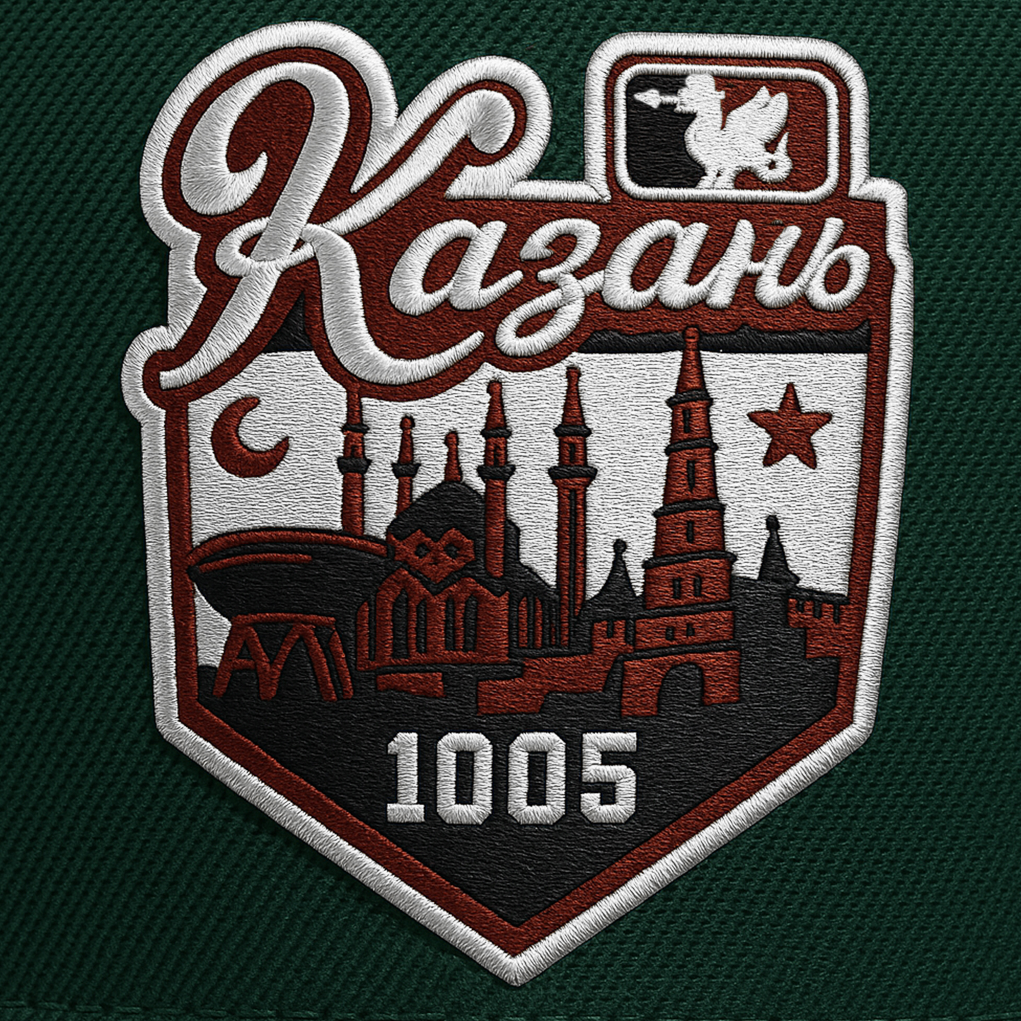 Фронтальная объемная вышивка представляет собой монограмму Кзн. На правой стороне вышивка стилизована под side-patches специальных серий игр MLB, на которой отображены достопримечательности Казани: мечеть Кул Шариф, Казанский Кремль, башня Сююмбике и центр семьи «Казан», а также, дракон Зилант с герба и год основания города.