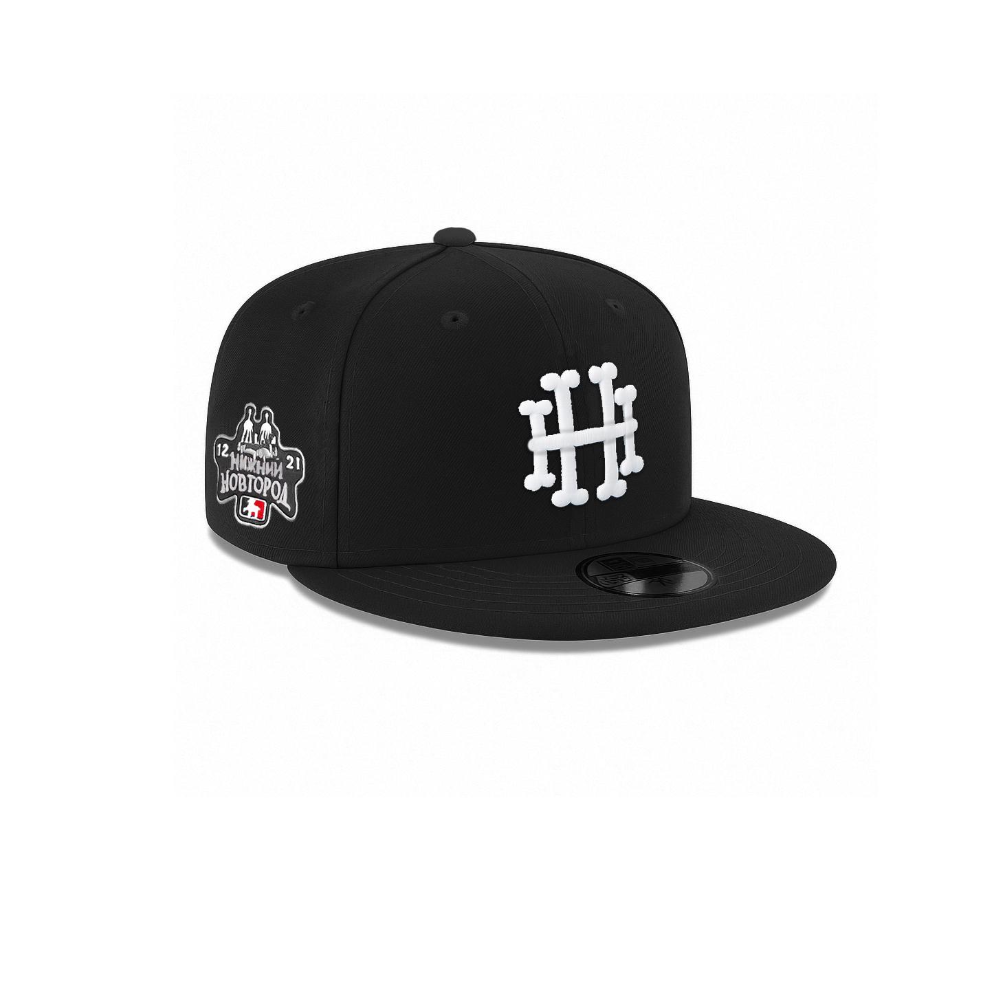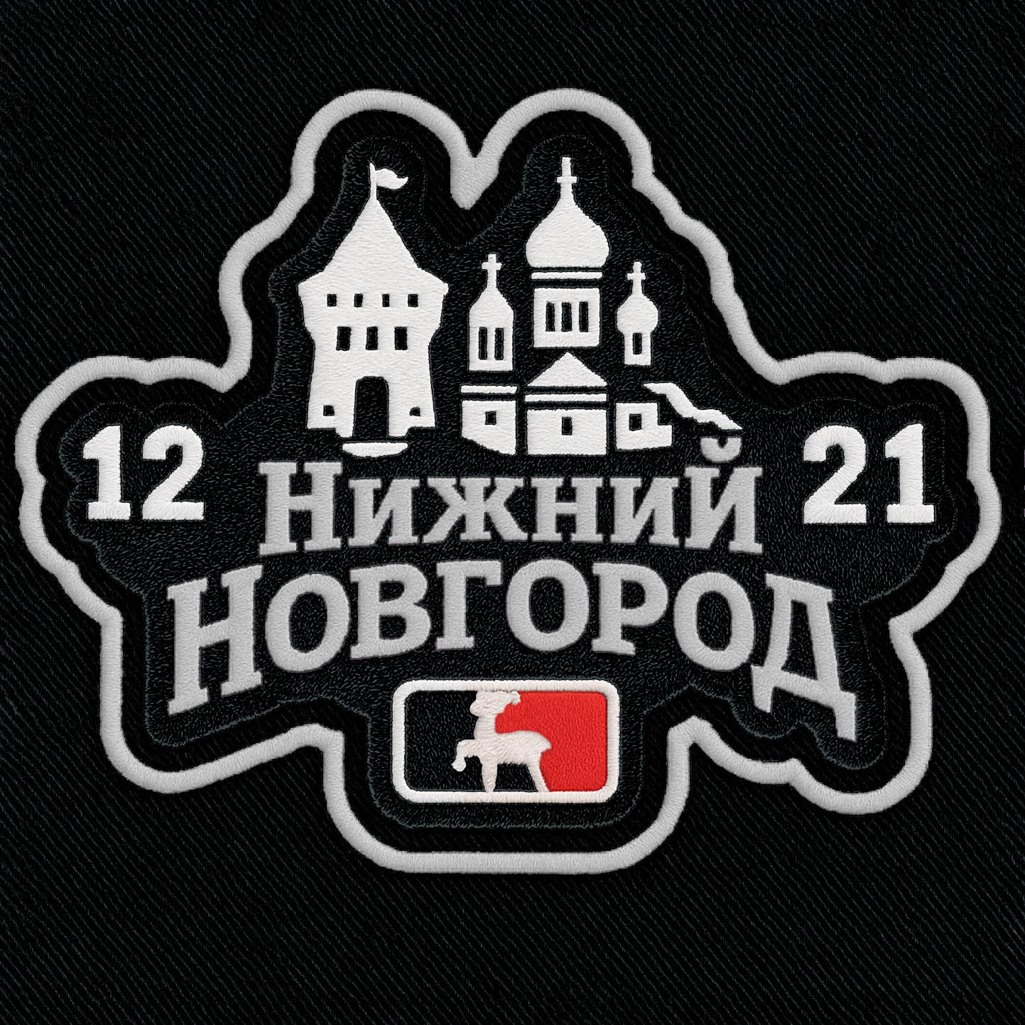 Фронтальная объемная вышивка представляет собой монограмму НН. На правой стороне вышивка стилизована под side-patches специальных серий игр MLB, на которой отображены достопримечательности Нижнего Новгорода: Дмитриевская башня кремля, Александро-Невский собор, а также, олень с герба и год основания города.